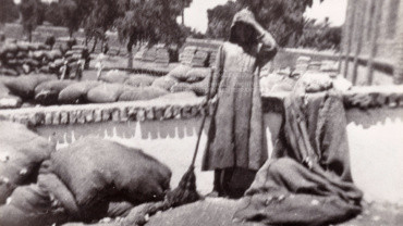 The picture depicts a worker from Vassilopoulo Frères & Co cotton ginning mill sitting next to cotton sacks, in Beni Mazar El Cobra.