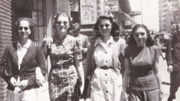 Μια παρέα από κοπέλες περπατά στους δρόμους της Αλεξάνδρειας τη δεκαετία του 1940. Από αριστερά προς τα δεξιά: Δήμητρα Θλιβίτου, Ευαγγελία Νικολάου, άγνωστο…